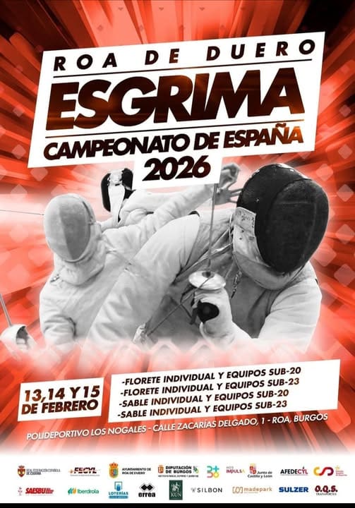El Instituto Provincial para el Deporte y Juventud de la Diputación de Burgos colabora en la organización del Campeonato de España de Esgrima 2026, que se celebrará del 13 al 15 de febrero en el Polideportivo Los Nogales de Roa de Duero. La cita reunirá a las mejores promesas nacionales de las categorías sub20 y sub23 en un fin de semana en el que la provincia volverá a situarse como referencia del deporte de competición.