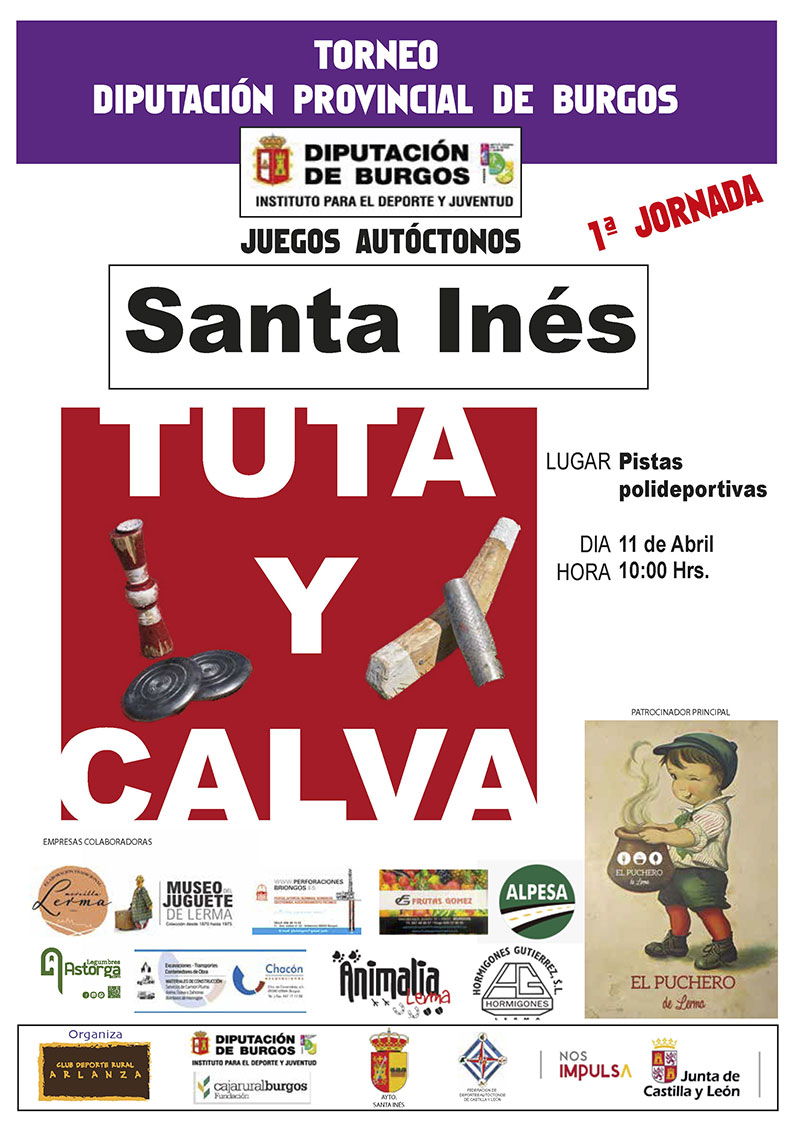 El Instituto Provincial para el Deporte y Juventud (IDJ) de la Diputación de Burgos colabora en la celebración del I Torneo de Tuta y Calva "Arlanza", una cita dedicada a la promoción de los juegos autóctonos que tendrá lugar el próximo 11 de abril en las pistas polideportivas de la localidad de Santa Inés (Burgos).