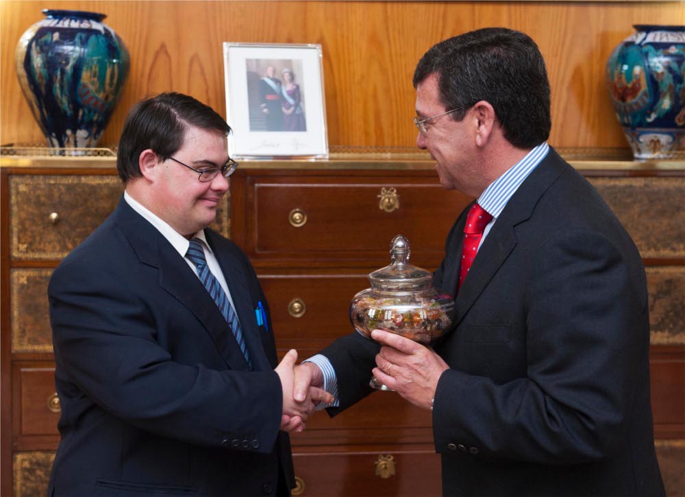 Entrega de un obsequio del ordenanza, Álvaro, al Presidente de la Diputación, César Rico.