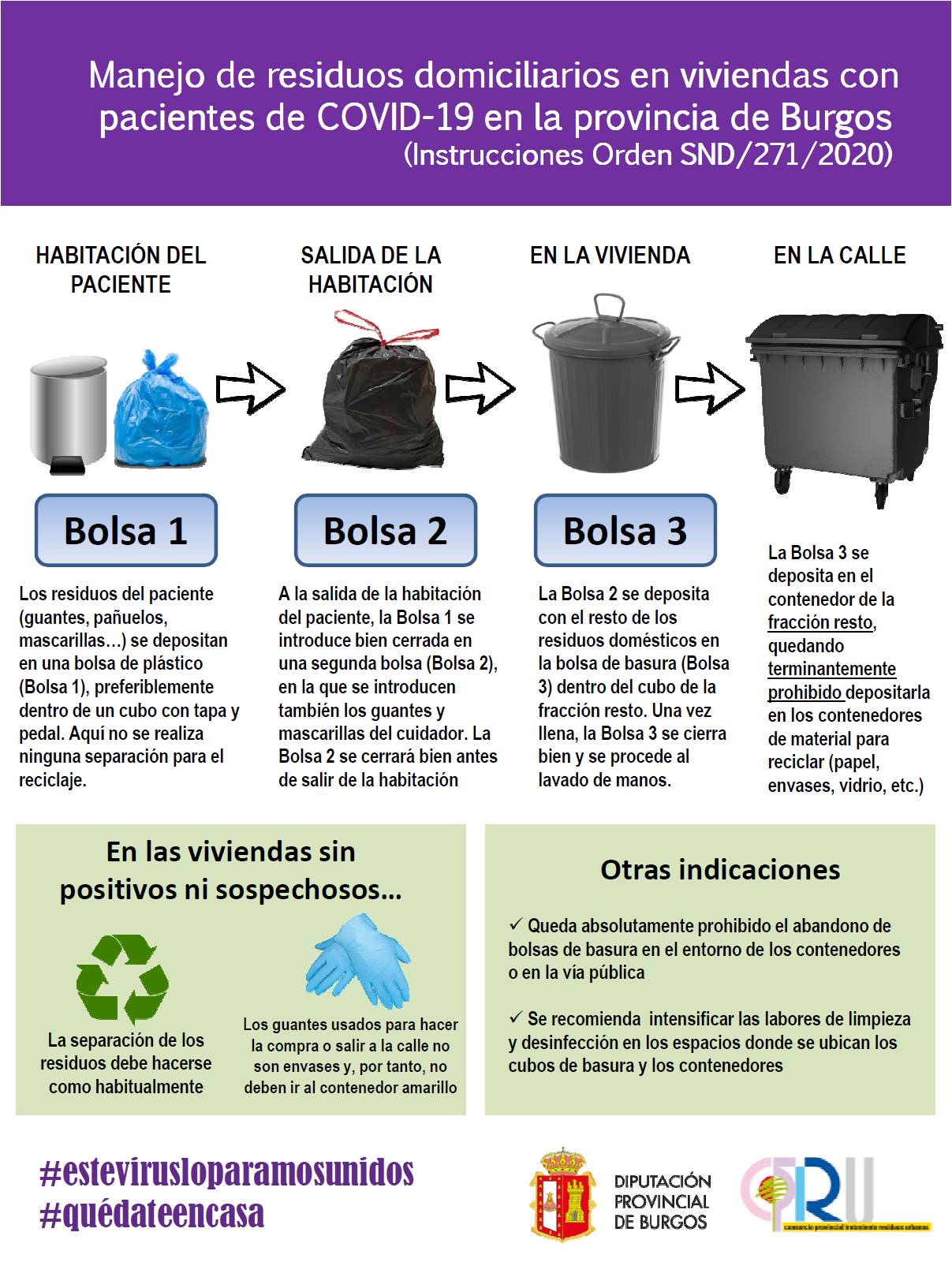 Mediante Orden SND/271/2020, de 19 de marzo, publicada en el BOE del domingo 22 de marzo, el Ministerio de Sanidad estableció las instrucciones sobre la gestión de los residuos domiciliarios en las viviendas de los ciudadanos afectados o que conviven con personas que sufren la infección por Covid-19. Son instrucciones muy importantes a seguir durante el periodo de crisis sanitaria con objeto de minimizar los riesgos que para la salud humana se derivan del manejo y la gestión de los residuos domiciliarios.